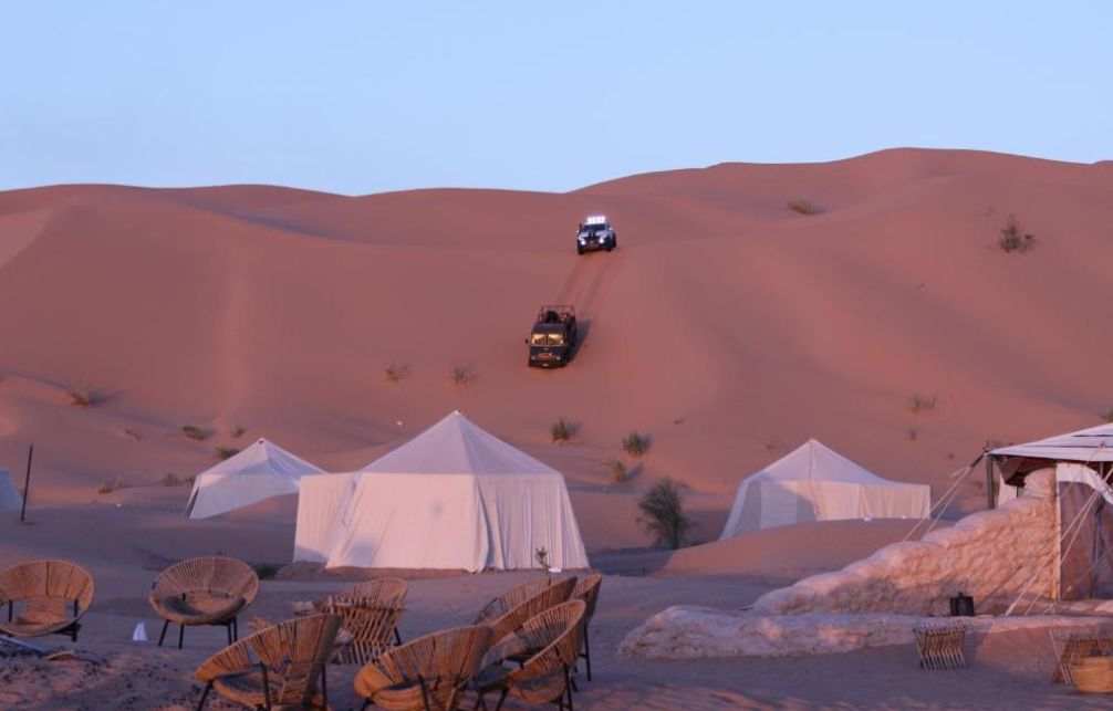 Situé sur la colline de Timbaine, à proximité des dunes de sable majestueuses, le Camp Mars vous offre une expérience unique en plein cœur du désert tunisien. Si vous cherchez à vous évader du quotidien et à découvrir la magie du Sahara dans un cadre authentique, ce campement est l’endroit parfait. Avec des tentes traditionnelles qui offrent une vue imprenable sur les dunes et un accueil chaleureux, Camp Mars vous garantit une expérience inoubliable.